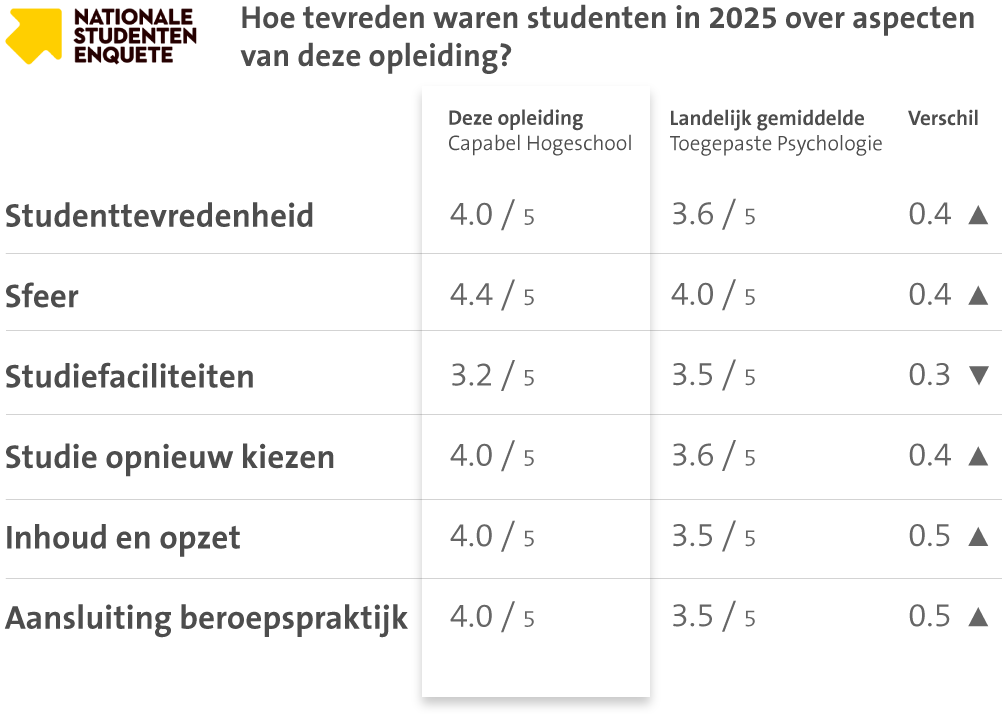 Bij Capabel Hogeschool verwerf je praktische psychologische kennis gelijktijdig met vereiste vaardigheden en rolinvulling. Deze unieke aanpak met relatief veel aandacht voor de praktijk maakt dat je als toekomstig HBO Toegepast Psycholoog samenhangend kennis, vaardigheden en houding integreert in je werk. De opleiding is daarom opgedeeld in projecten met steeds een nadruk op een andere combinatie van psychologische kennis en vereiste beroepsrollen. Dit geeft de beste voorbereiding op handelen in de actuele beroepspraktijk van de HBO Toegepast Psycholoog.